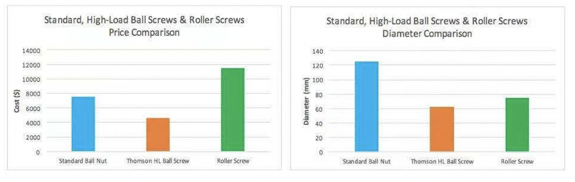 標(biāo)準(zhǔn)配置的滾珠絲杠可以解決這個(gè)問(wèn)題,但是它的直徑是高負(fù)載滾珠絲杠的兩倍,而且價(jià)格同比高出63%。滾柱絲桿也有該負(fù)載能力,但相對(duì)于高負(fù)載滾珠絲杠,螺母尺寸大50%,價(jià)格高出150%。