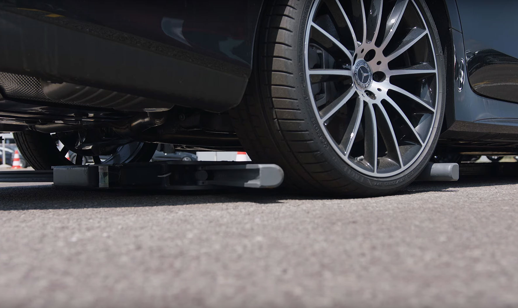 Figure 3. Except for the two fixed pliers shown, six pliers remain retracted until the Stanley parking management software signals six actuators to move them into place to grip the vehicle tires.