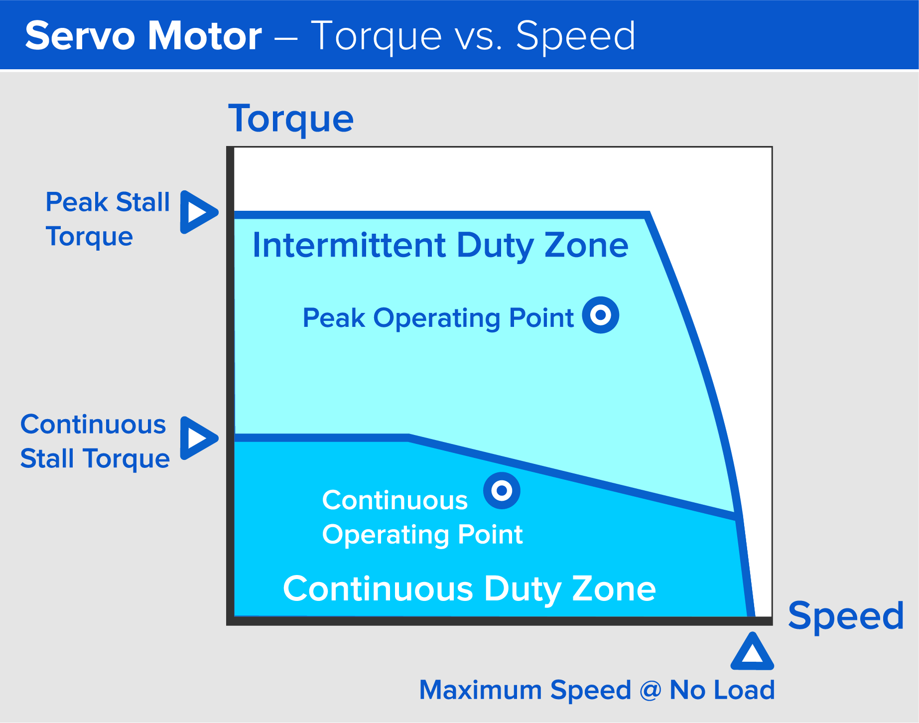Figure 1: Servo motor torque vs. speed. The average of the maximum and minimum operating points must fall within the continuous duty curve specified by the motor manufacturer. Image courtesy of Thomson Industries, Inc.