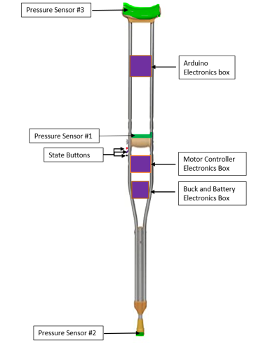 As illustrated in the purple sections of Figure 4, the team distributed the electronics evenly throughout the crutch frame to achieve optimal balance. A microprocessor in an electronics box near the top of the crutch frame receives analog signals from pressure sensors located in the armrest, handle and bottom, and sends them to the motor controller located in a box below it.